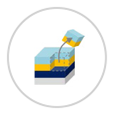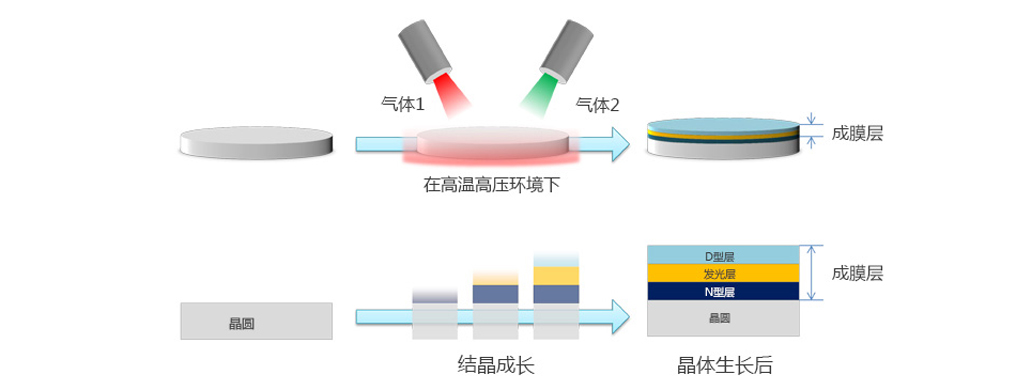 接下來(lái)是“晶體生長(zhǎng)”。在這里,我們?cè)诰A上制作用于發(fā)光作為L(zhǎng)ED的薄膜。頂部是過(guò)程的俯視圖,底部是橫截面。在晶片周圍的高溫高壓環(huán)境下吹入氣體,并通過(guò)化學(xué)反應(yīng)在晶片表面上沉積形成薄膜。這樣重復(fù)多次以制作多層薄膜結(jié)構(gòu)。